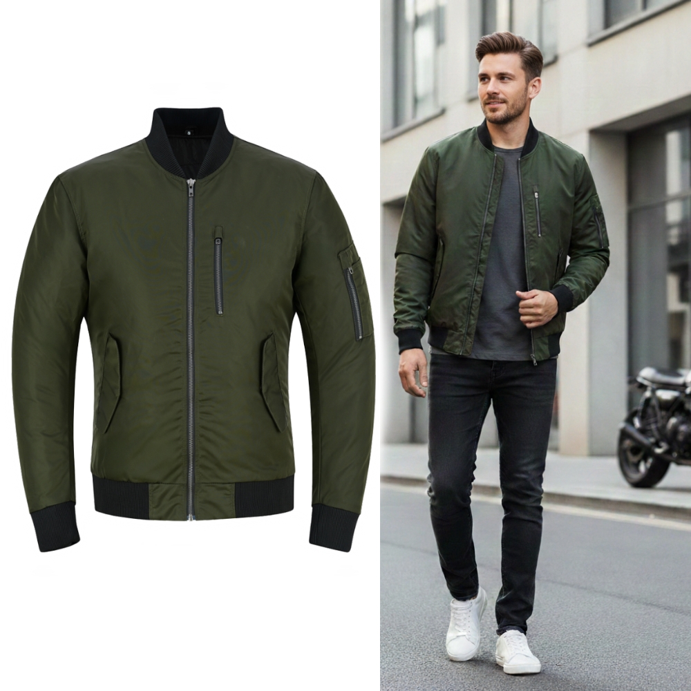 Stylish motorcycle bomber jacket with removable CE Level 1, Type B protectors, a pocket for a back protector, and elastic cuffs. Made of lightweight 100% polyester, it boasts practical pockets and the option to wear it without protectors. more